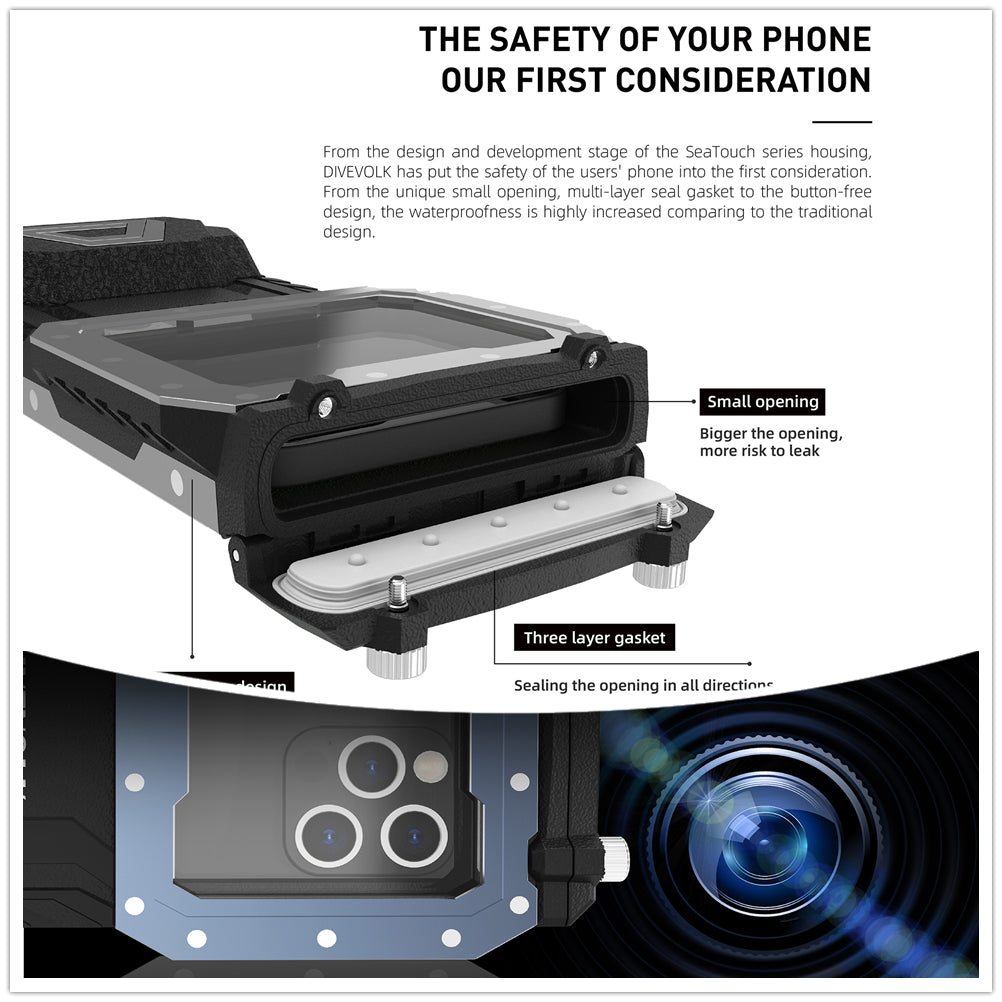 The small opening and button free design minimise the areas where water ingress can occur. As long as you maintain the Triple layer gasket you can be confident that your phone will be secure all the way down to 60 meters.