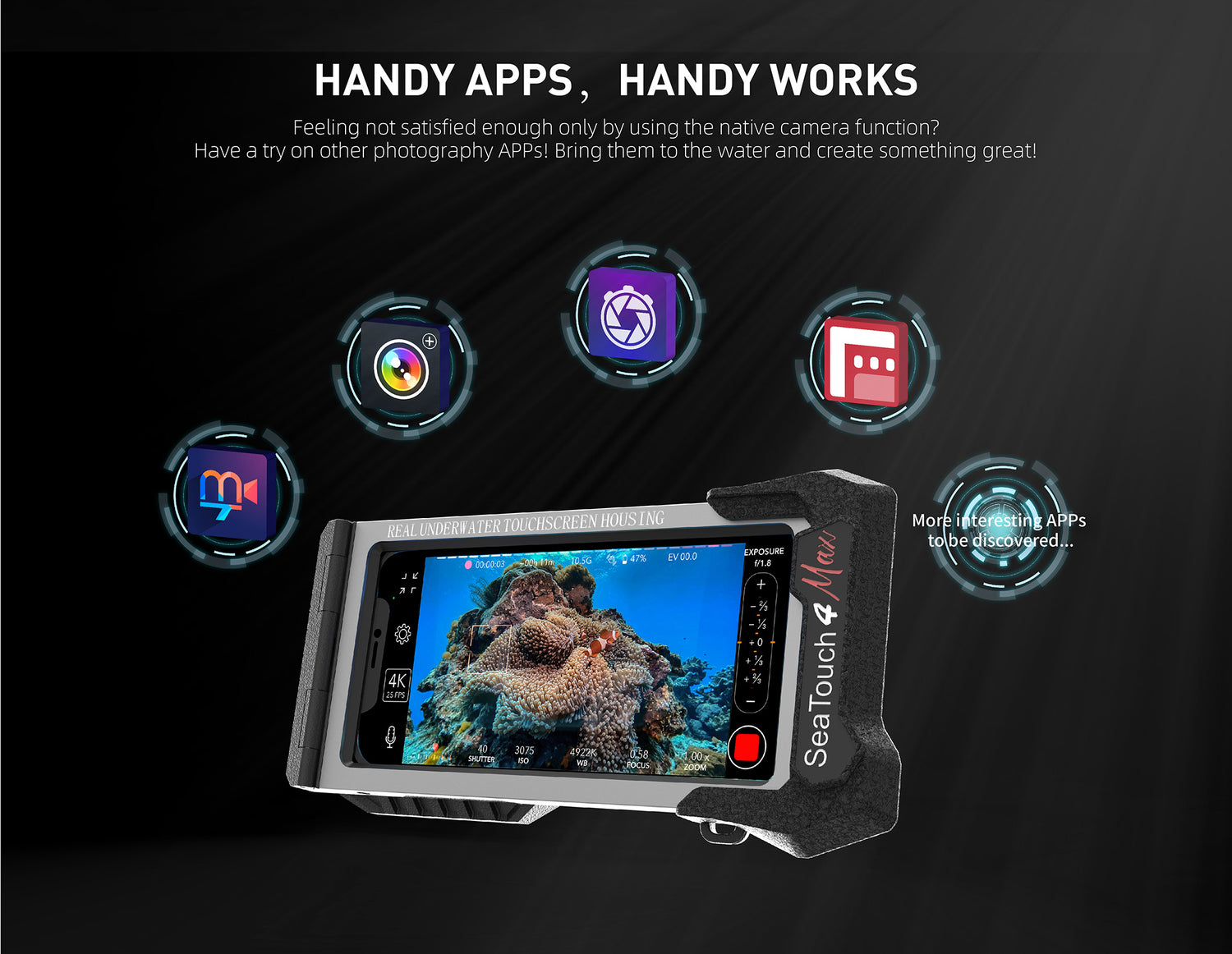 Other Phone housings require you to use an App to connect your phone. SeaTouch 4 Max has no such requirement leaving you free to use any of your favourite Apps including the native camera.Other Phone housings require you to use an App to connect your phone. SeaTouch 4 Max has no such requirement leaving you free to use any of your favourite Apps including the native camera.
